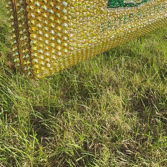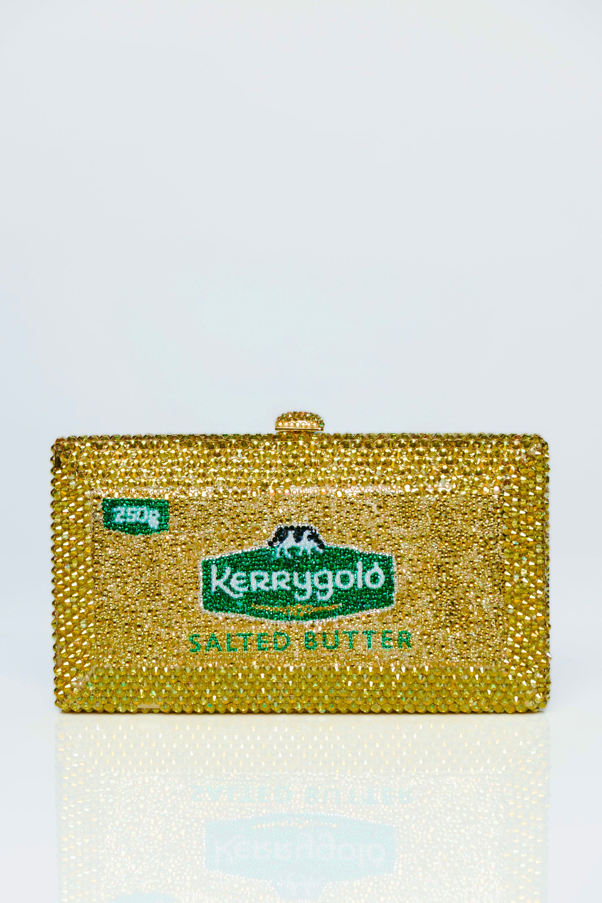 An ode to Ireland’s golden treasure, Kerrygold butter, this clutch celebrates heritage with a touch of playful opulence. The Kerry Gold Crystal Clutch transforms a classic silhouette into a modern statement, hand-finished with dazzling crystals that shimmer like sunlight on rolling Irish fields.